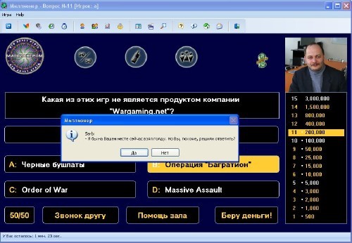 Данная игра - бесплатный аналог телешоу "Кто желает стать миллионером? ". Игра поддерживает звук (для этого нужно скачать со странички игры и распаковать в папку игры архив со звуками), показ заранее подготовленных фото в начале игры и во время выигрыша несгораемых сумм либо после каждого правильного ответа, обратный отсчет (дается определенное время на ответ), имеет интегрированный редактор вопросцев (Вы можете добавлять новые вопросы и редактировать существующие). Игра содержит наиболее 2000 вопросцев, которые не будут повторяться до тех пор, пока не будут исчерпаны. Кроме того, Вы можете менять цвет фона главного окна и прозрачность всех окон игры. Игра запоминает игроков и выигранные ими суммы, показывает их рейтинг. Эта игра пр